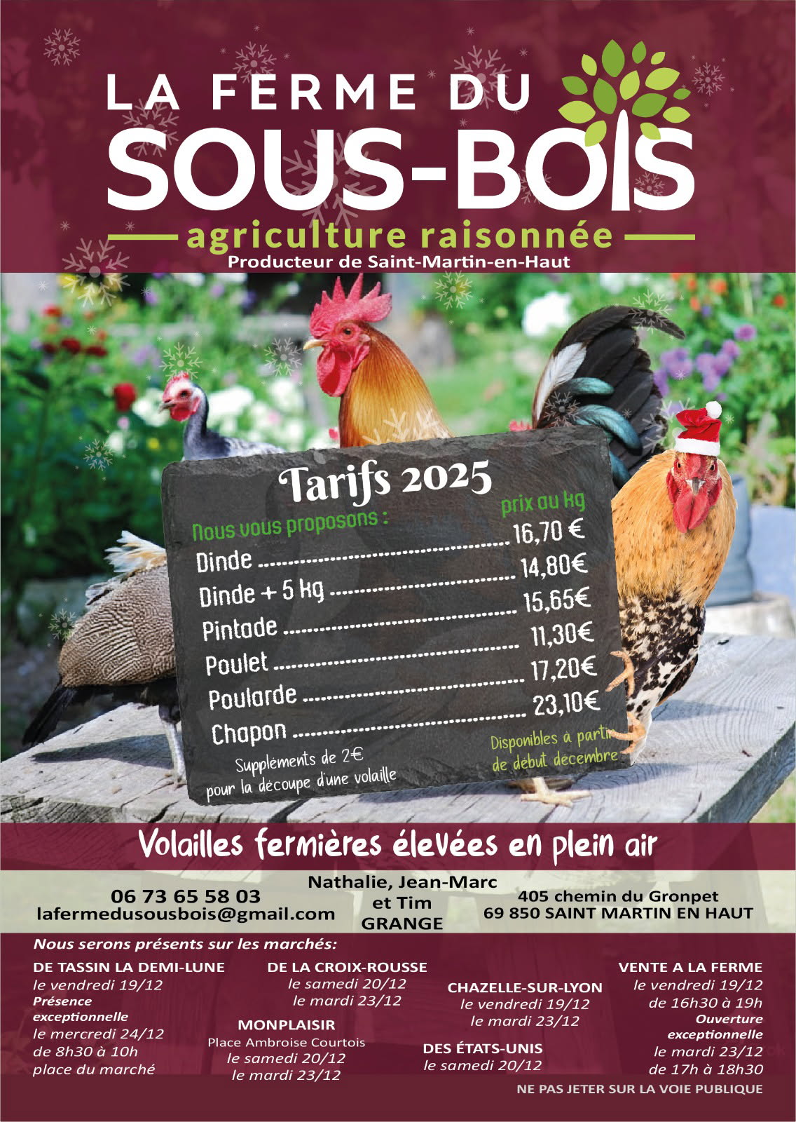 Produit précédent Produit suivant Poulet fermier élevé en plein air 11,30€ par kg ⚠ Les prix sont donnés à titre indicatif car le poids réel des produits et leur indisponibilité le jour du retrait peuvent faire évoluer le tarif final. En stock Poids (kg) Prix produit quantité de Poulet fermier élevé en plein air Ajouter au panier Produits similaires Volailles élevées en plein airCarcasse de poulet 1,50€ Ajouter au panier Volailles élevées en plein airFilet de poulet fermier 5,30€ Ajouter au panier Volailles élevées en plein airDinde fermière élevée en plein air 16,70€ par kg Sélectionnez les options Volailles élevées en plein airDinde fermière +5kg élevée en plein air 14,80€ par kg Sélectionnez les options